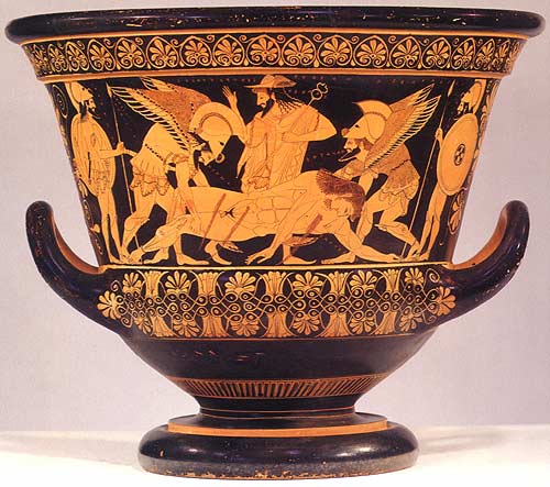 DERIVES FROM TIMELESS MYTH Sarpedon and Glaucus (Glaucos) were co-captains of the Lycian forces, and allies of Troy. The two Lycian heroes were cousins; they were grandsons of the hero Bellerophon. Glaucus was the son of Hippolochus. There are some confusion over who were Sarpedon' parents. Some say that Sarpedon was the son of Zeus and Europa, and brother of Minos and Rhadamanthys. If that were the case, then Sarpedon would be very old. Another version says that the Cretan Sarpedon migrated to Lycia, when he was driven off from Crete by Minos. Evander, Sarpedon's son, married Deïdameia (Deidameia), daughter of Bellerophon. It was Evander and Deïdameia who were parents of Sarpedon. Therefore, the Sarpedon, who fought in Troy, was the grandson of the Cretan Sarpedon (Europa's son). In a third version, Homer says that, Sarpedon was the son of Zeus and Laodameia, another daughter of Bellerophon. Personally, I think the second version was more probable. During the war, Sarpedon was one of the better fighters on the Trojan side. Sarpedon killed Tlepolemus, son of Heracles and Auge, leader of the Rhodians. While Glaucus encountered the divine-inspired Diomedes, until they had both discovered each other's lineage. Apparently, their grandfathers were once guest-friends (Bellerophon and Oeneus). Instead of fighting one another in combat, the two enemies exchanged armours, promising to avoid one another in combat. Sarpedon and Glaucus distinguished themselves in the fighting, two days later. They led one of the strongest attacks on the wall of the Greek camp. But on that same day, Sarpedon was killed by Patroclus, companion of Achilles. Furious fighting was fought over Sarpedon's body, until his body was recovered by the god Zeus (who was his father, according to Homer). Sarpedon's body was brought back to Lycia by the gods, Hypnos ("Sleep") and Thanatos ("Death"), for proper funeral. When Achilles was killed, there was another furious fighting over Achilles' body. Glaucus was killed by the Ajax, son of Telamon, who was standing guard over the Achilles' body. |